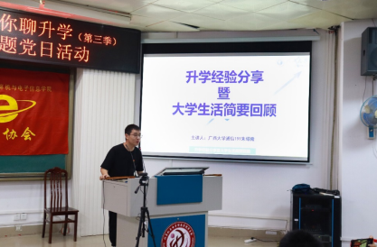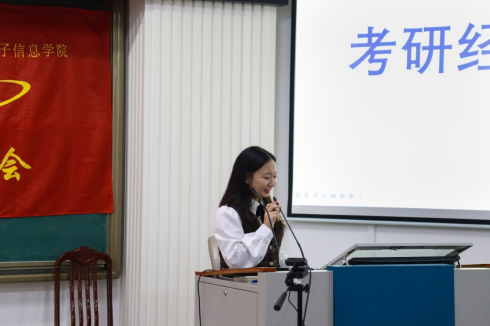 读硕的通信工程182班吴艳丽同志。吴艳丽同志分享了自己的考研动力、信息获取渠道、如何选择报考学校与专业、如何复习各考试科目,并鼓励同学们在考研的过程中要保持良好心态、坚持不懈。