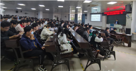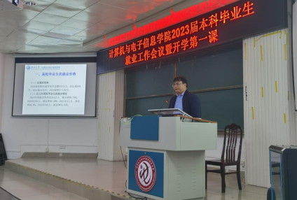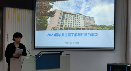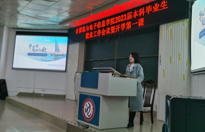 在214报告厅召开2023届本科毕业生就业工作会议暨开学第一课。学院党委副书记邓珍琪老师、学院辅导员杨洋老师和李易明老师、学院教学办公室甘瑜萍老师和罗程老师,以及学院全体2023届本科毕业生参加会议。会议由邓珍琪老师主持,会议主题是“顺利完成学业,尽快落实就业单位”。