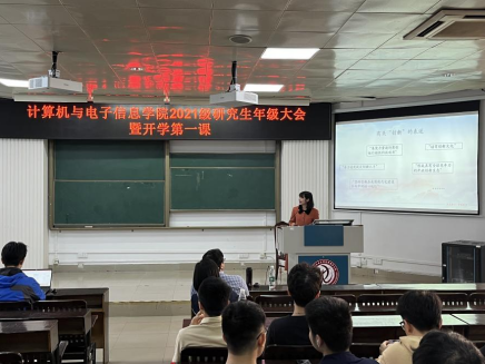 2021级研究生年级大会暨开学第一课在学院214报告厅举行。学院党委书记钟诚教授、学院党委副书记邓珍琪老师、学院研究生秘书胡亮青老师、辅导员及兼职辅导员参会。会议由学院团委副书记、辅导员杨洋老师主持。