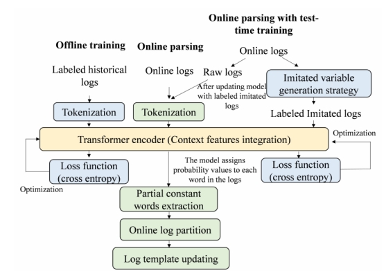 将半结构化日志转换为结构化日志的日志解析是智能日志分析的关键第一步。然而,由于新日志中会出现新的日志类型,现有的解析器在实际应用中仍不能令人满意,此外根据现有日志设置的解析器参数很难泛化支持新的日志类型,对此,该论文提出一种可变生成模仿策略来设计具有泛化能力的新的日志解析方法Log3T。Log3T分为离线训练和在线解析两部分。在离线训练阶段,Log3T将日志解析制定为二分类任务,利用标记的历史日志来训练Transformer编码器;在在线训练阶段,根据模型分配给单词的概率,从新出现的日志中提取最有可能的常数单词,在此基础上将新日志划分为不同的日志组,进而生成具有代表性的日志模板。为了增强模型泛化到新的日志类型的能力,Log3T进一步开发了一个包含测试时间训练的在线解析版本。在16个基准数据集上的实验结果表明,Log3T的解析准确率超过了当前的解析器,并能自动适应新日志类型。Log3T日志解析器软件在GITHUB开源(//github.com/gaiusyu)。