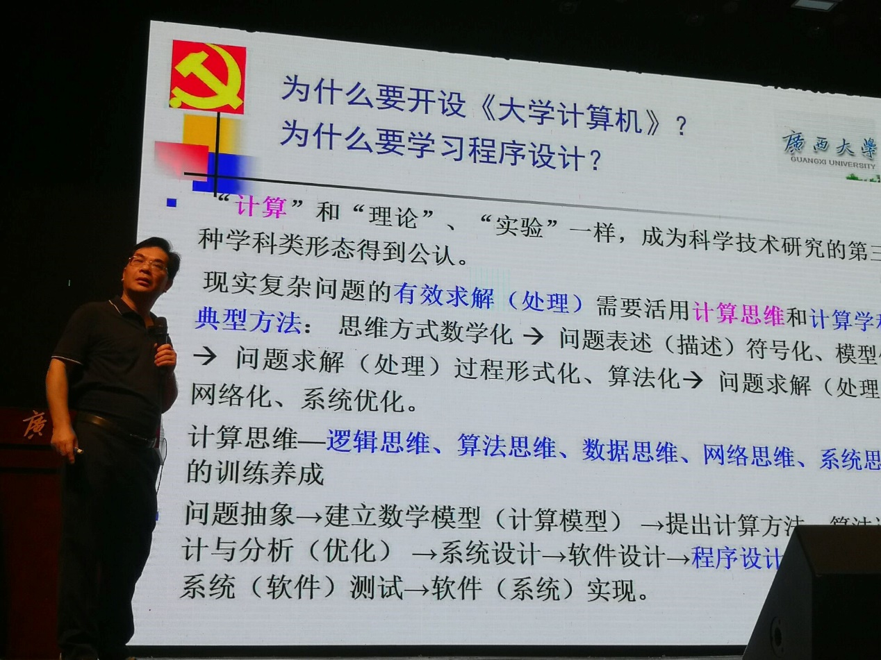 最后,钟诚教授对“为什么要开设《大学计算机》课程?为什么要学习程序设计?”进行阐述,强调了培养学习运用计算思维对开展科学技术研究的重要性和现实意义。