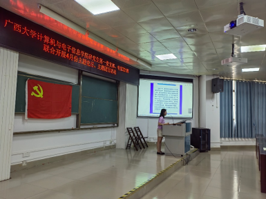 研究生第一党支部和电信221班在学院214报告厅联合开展主题党日、主题团日活动。本次活动由研究生第一党支部副书记韦惜旖同志主持。