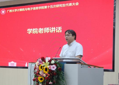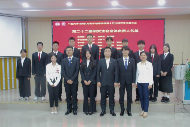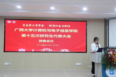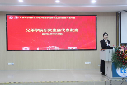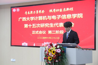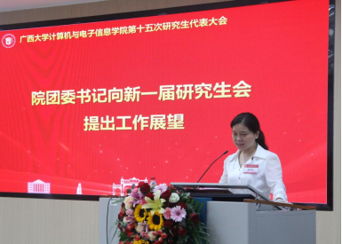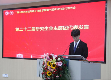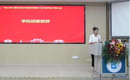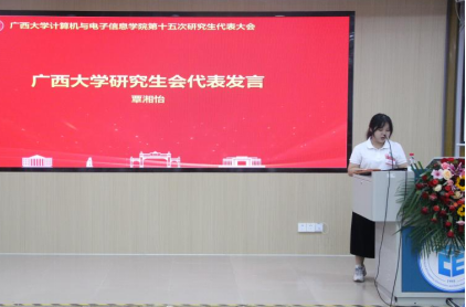 研究生会代表覃湘怡同学致辞。她对过去一年计算机与电子信息学院研究生会开展的工作表示肯定,并希望学院新一届研究生会与校研究生会继续保持密切沟通与联系,继续在服务同学、推动学术创新和提升校园文化活力方面共同努力。