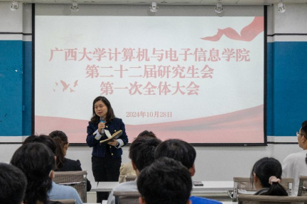 会议第五项,学院团委书记杨洋老师讲话。她强调,研究生会成员要主动承担工作任务,牢记服务宗旨,部门内以及部门间要加强沟通与交流,努力建设好有创新性、发展性的研究生会。