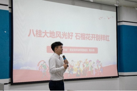 “00后”君武青年讲师团成员、外国语学院2022级研究生周洋舟同学作主题宣讲。周洋舟同学以“八桂大地风光好,石榴花开别样红”为主题,以人民币上的民族语言为切入点,深入阐述了民族团结的重要性,并结合习近平总书记2023年12月在广西考察期间的重要讲话精神,呼吁青年用实际行动和创新思维,将民族团结融入日常生活、学习和工作中,用心用情让民族团结之花绽放在八桂大地。