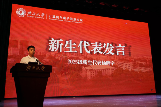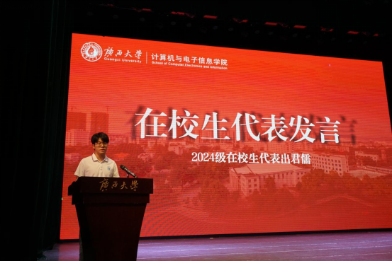 2024级硕士研究生出君儒作为老生代表,用真切体会为新生引路。他提醒本科生重视高等数学、数据结构等基础课,“这些是人生大楼的钢筋混凝土”;对研究生,他分享“三下乡”实践经历,强调“科研从不是单打独斗”,鼓励新生在师生守望中完成从“学知识”到“创知识”的跨越。他特别寄语:“学院要培养的不是‘会写代码的机器’,而是‘有温度的计电人’。”
