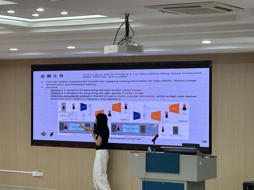 在科研方面,邹博士分享了团队两项最新研究成果。其一为细粒度服装属性编辑。团队构建了新数据集,提出基于对抗生成网络的两阶段框架,实现精准的时尚图像反转。并基于精准的图像反转能力,提出少样本属性编辑方法实现“改一不改二”的细粒度属性的独立编辑。其二为文本渲染控制,团队开发了基于Rectified Flow的框架(适配SD3或者Flux),通过控制令牌和风格适配器,能同时处理基础文字排版、艺术字风格化、以及场景文字渲染,实现对文字的单词级精准控制。文本渲染作为GenAI的一个基础任务,同时也可用作服装的印花设计。这个例子进一步展示了人工智能与时尚交叉领域研究的广阔边界。