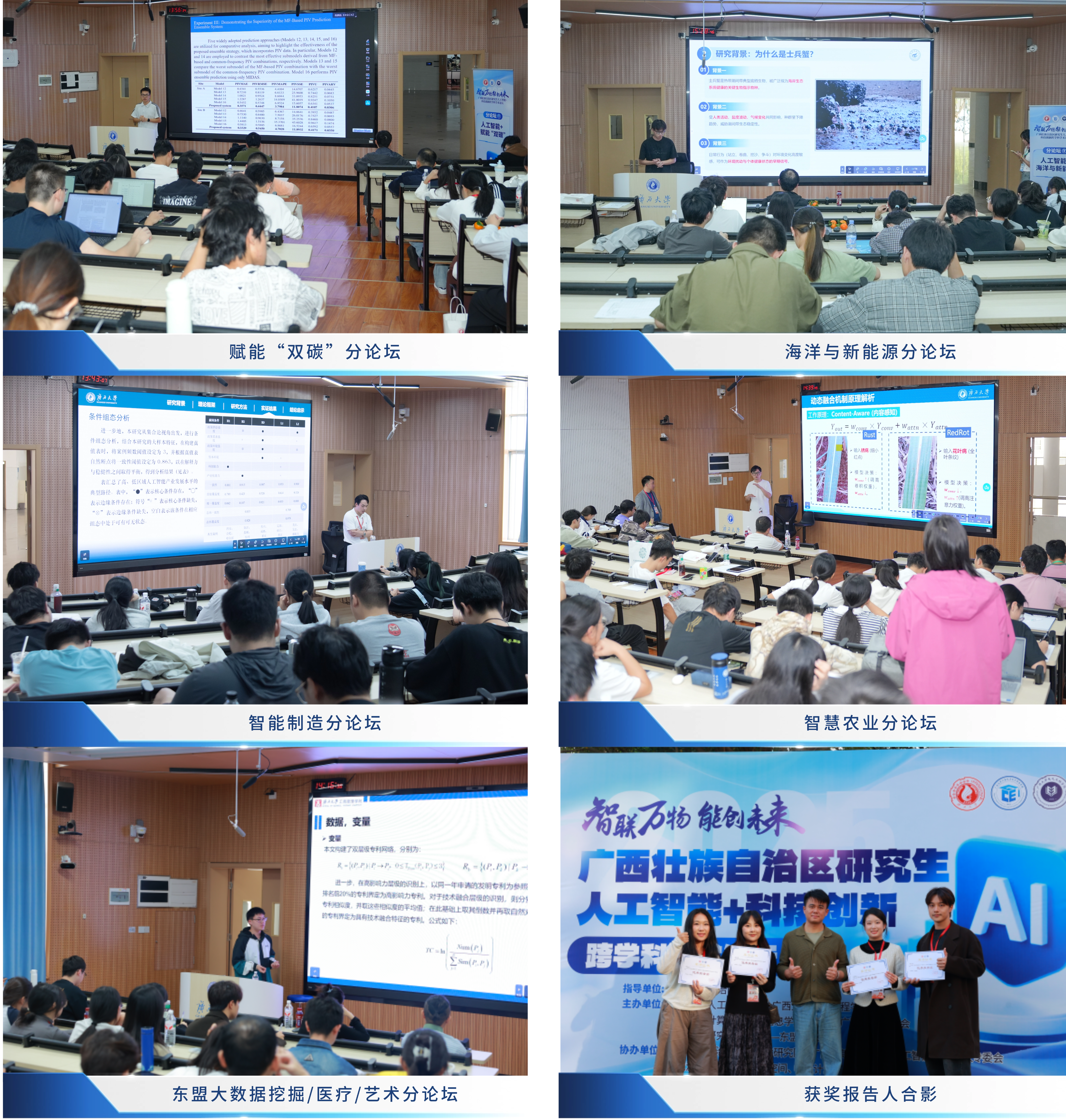 论坛聚焦 “AI+”跨学科深度融合,设置了涵盖 “人工智能+双碳”、“人工智能+海洋与新能源”、“人工智能+智能制造”、“人工智能+智慧农业”、“人工智能+东盟大数据挖掘/医疗/艺术” 等多个前沿方向的分论坛。来自全区各高校不同学科背景的研究生们围绕这些主题,汇报最新研究成果,展开了热烈而深入的探讨。现场思想碰撞频繁,交流氛围十分活跃,充分展现了广西青年学子勤于思考、敢于创新的精神风貌。