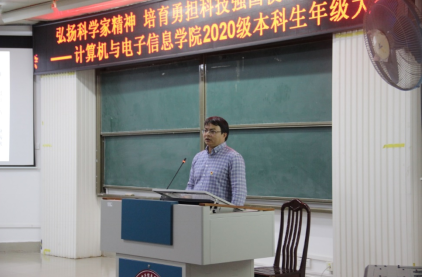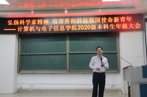 在214报告厅组织召开“弘扬科学家精神 培育勇担科技强国使命新青年”为主题的2020级本科生年级大会。学院党委书记钟诚教授、学院党委副书记邓珍琪老师、学院团委书记莫国志老师、学院教学办甘瑜萍老师及2020级全体本科生参加会议。会议由兼职辅导员张小银同志主持。
