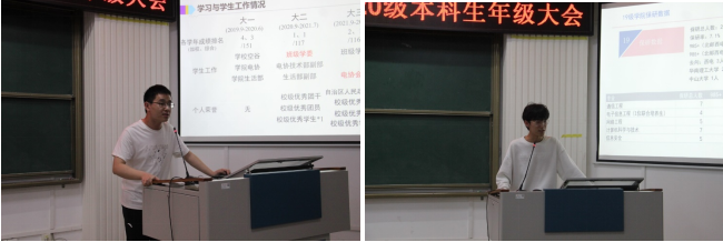 然后,2019级朱硕隆和王志鹏同学分享了个人学习工作经历、学习方法、科研竞赛实践、学生工作服务、考研、就业等情况,并给同学们提出一些建议。