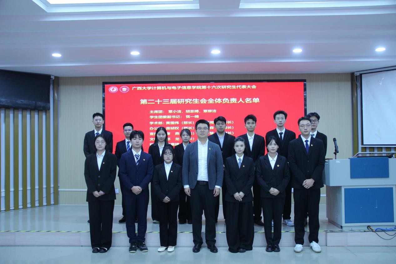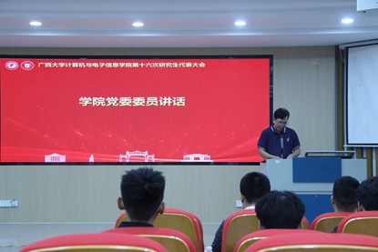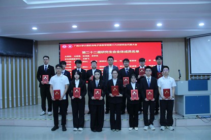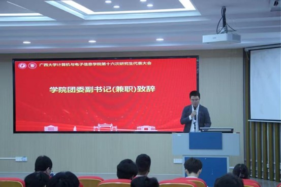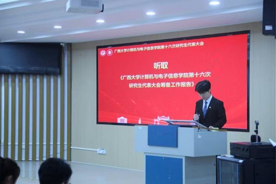 第十六次研究生代表大会在学院214报告厅召开。学院党委委员蒙祖强教授、学院团委副书记(兼职)胡亮青老师、学院团委委员林文潮老师、辅导员、校研究生会代表以及各学院研究生会代表出席本次大会。本次大会分为预备会议和正式会议两部分,由25级计算机技术专业阮梅琳同学主持。