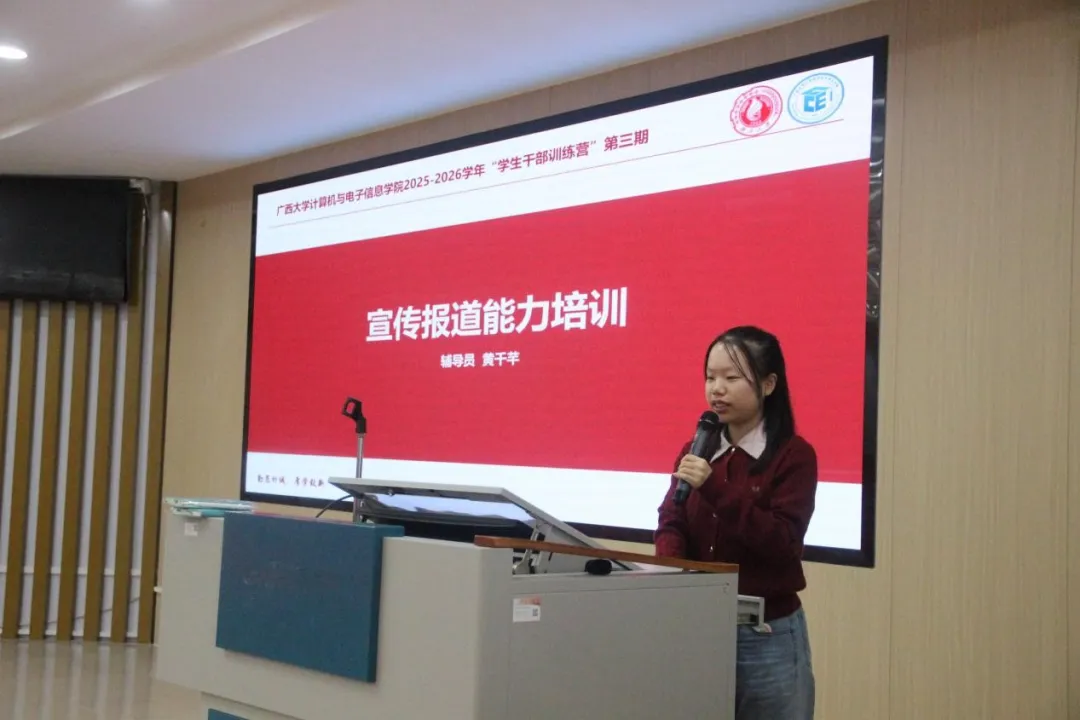 2025-2026 学年 “学生干部训练营” 第三期培训活动在学院 214 报告厅圆满开展。本次培训聚焦学生干部宣传报道核心能力提升,特邀学院辅导员黄千芊老师担任主讲嘉宾,全体参训学生干部参与学习。